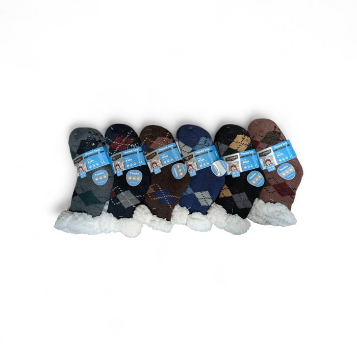 Chausson Chaussette très confortable avec gomme antidérapante. Intérieure molletonné grosse bouclette. Bord côte molletonné retourné. Motif intersia. 6 couleurs différentes. 2 tailles : 28-31 32-35.