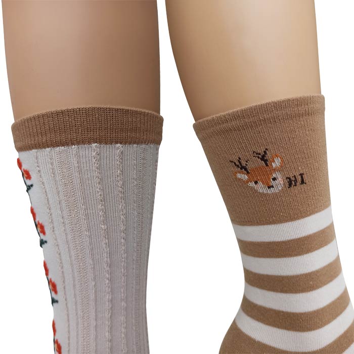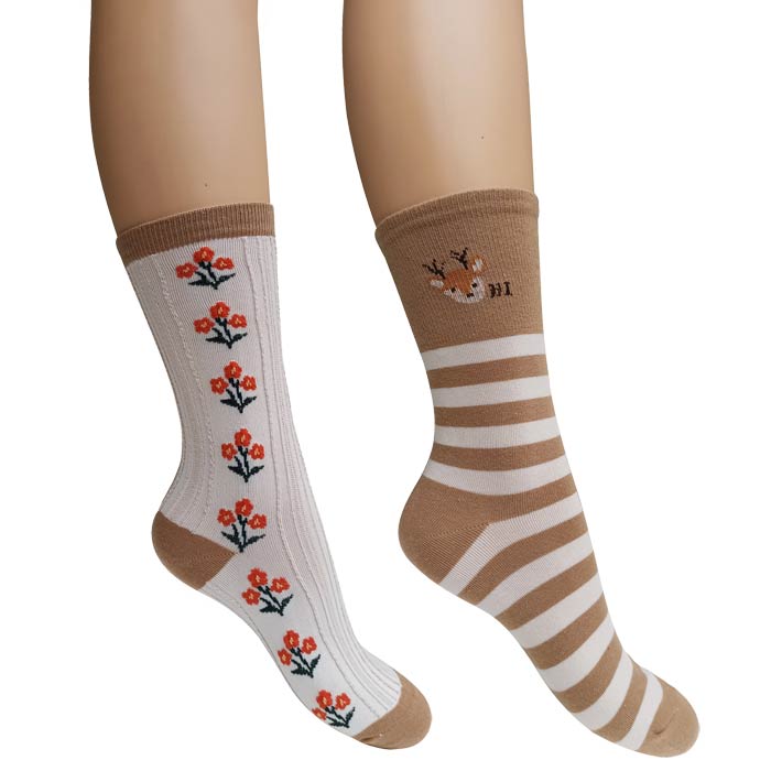 Chaussette femme tige moyenne coton majoritaire 98% dans les tons beiges, écrus. Motifs "fleurs, rayures, rennes... etc" sur l'ensemble de la chaussette. Voir photos. Taille unique : 35-40.