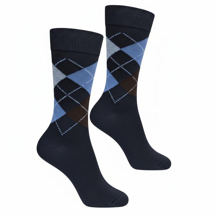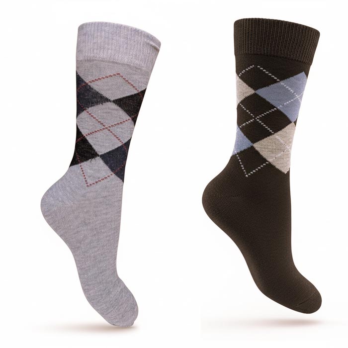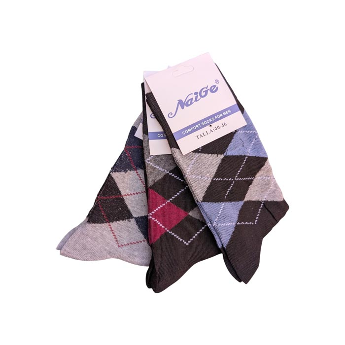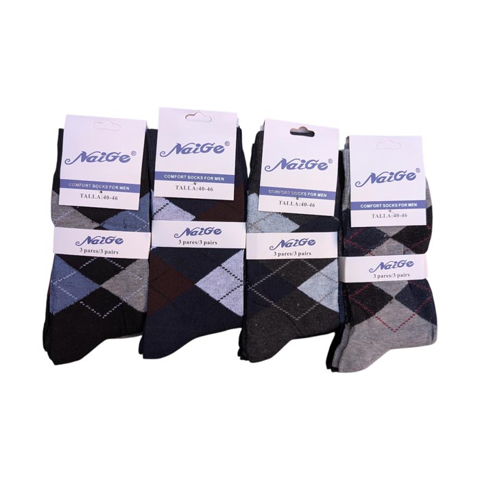 Chaussette homme tige moyenne, coton majoritaire. Motif "losanges, intersia.". Cavalier cartonné pour mise en rayon immédiate. Différents coloris. Taille unique 40-46.