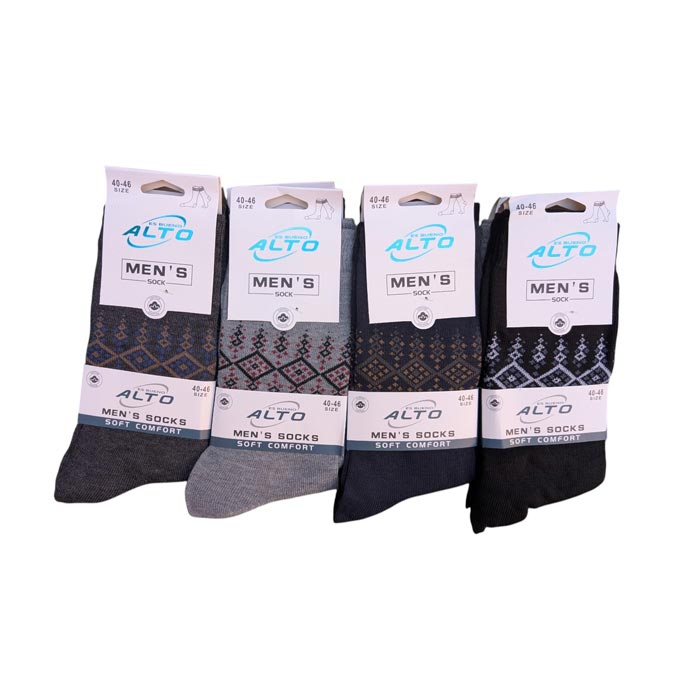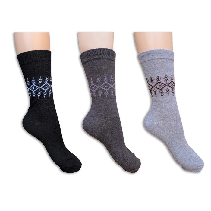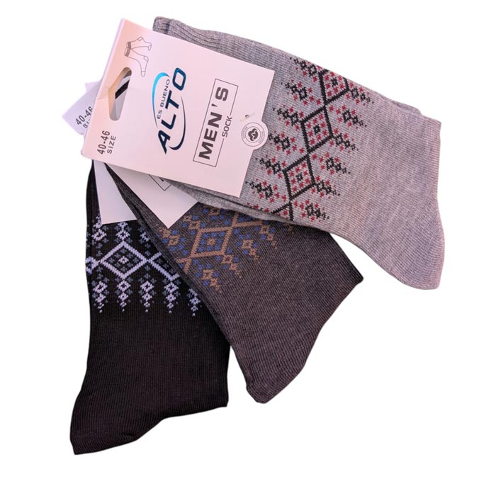 Chaussette homme tige moyenne, coton majoritaire. Motif "losanges sur le haut de la tige.". Cavalier cartonné pour mise en rayon immédiate. Différents coloris. Taille unique 40-46.