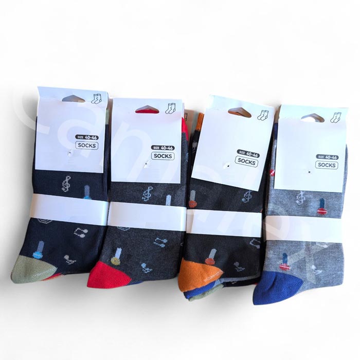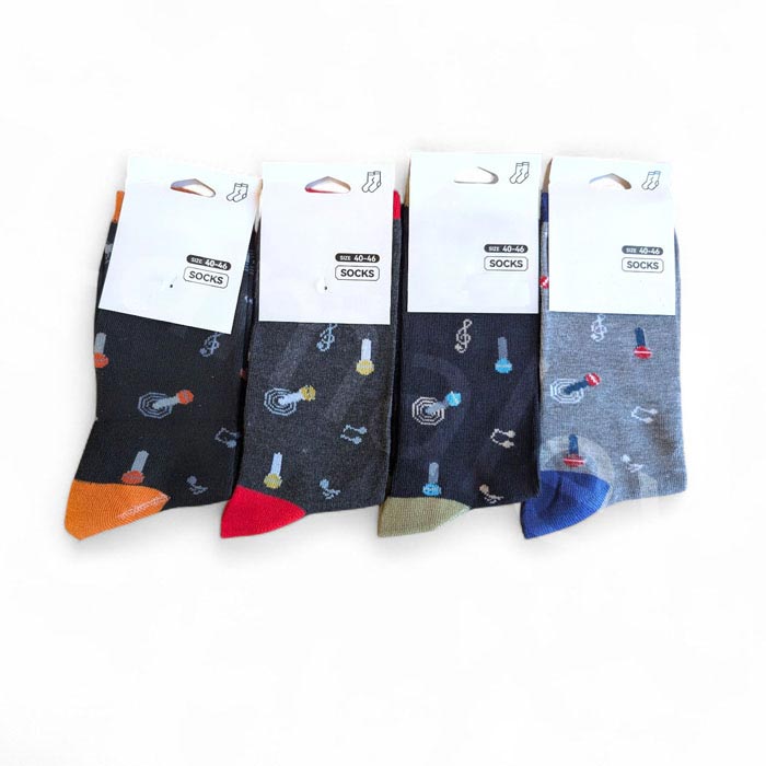 Chaussette homme tige moyenne pour homme, coton majoritaire. Chaussette avec motif "note de musique, micro...etc"(voir photos). Bord côte, bout de pied et talons contrastés. Taille unique 40 à 46.