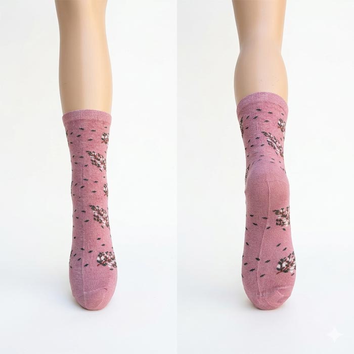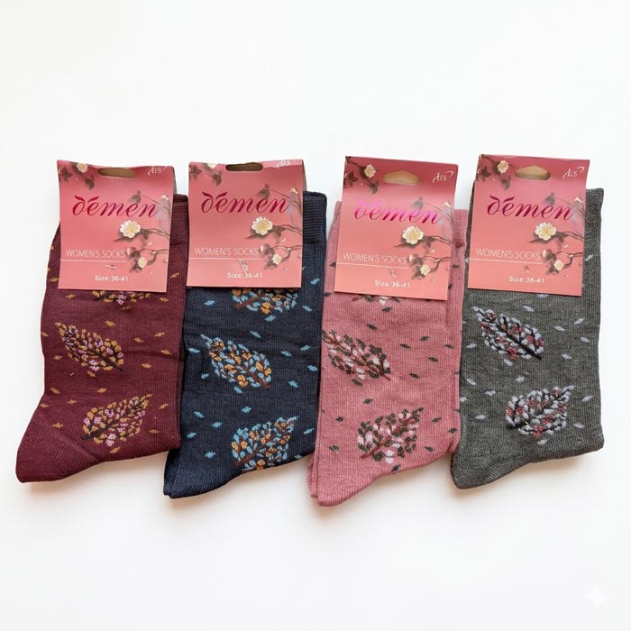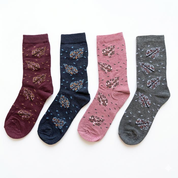 Chaussette femme tige moyenne coton majoritaire 87%. motifs "feuilles argentés ou dorées" sur l'ensemble de la chaussette, voir photos.