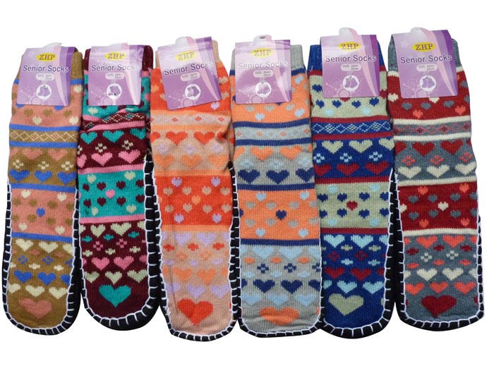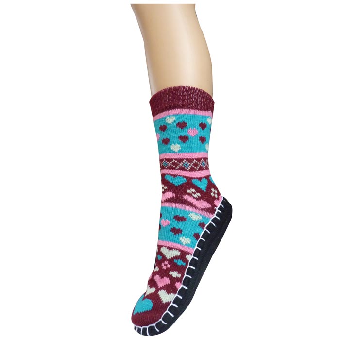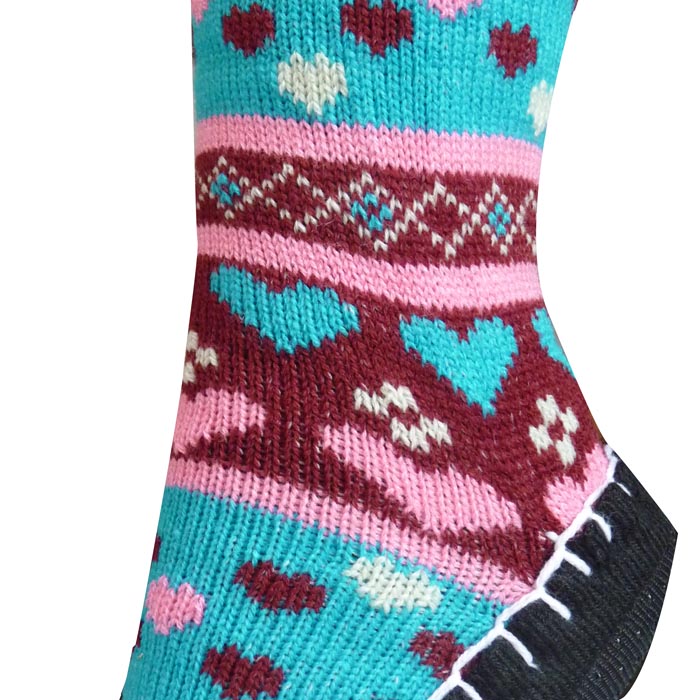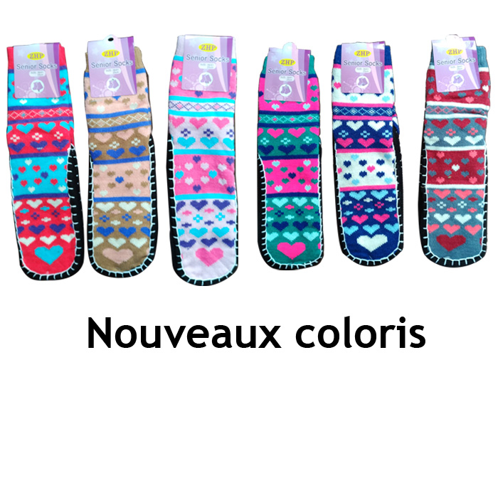 Chaussette pantoufle femme tige moyenne ,tricotée, motif cœur multicolores - Doublée à l'intérieur d'un tricot jersey chaud. Semelles antidérapantes avec micro points gomme. Couture sur le pourtour de la semelle. Taille unique. ATTENTION NOUVEAUX COLORIS